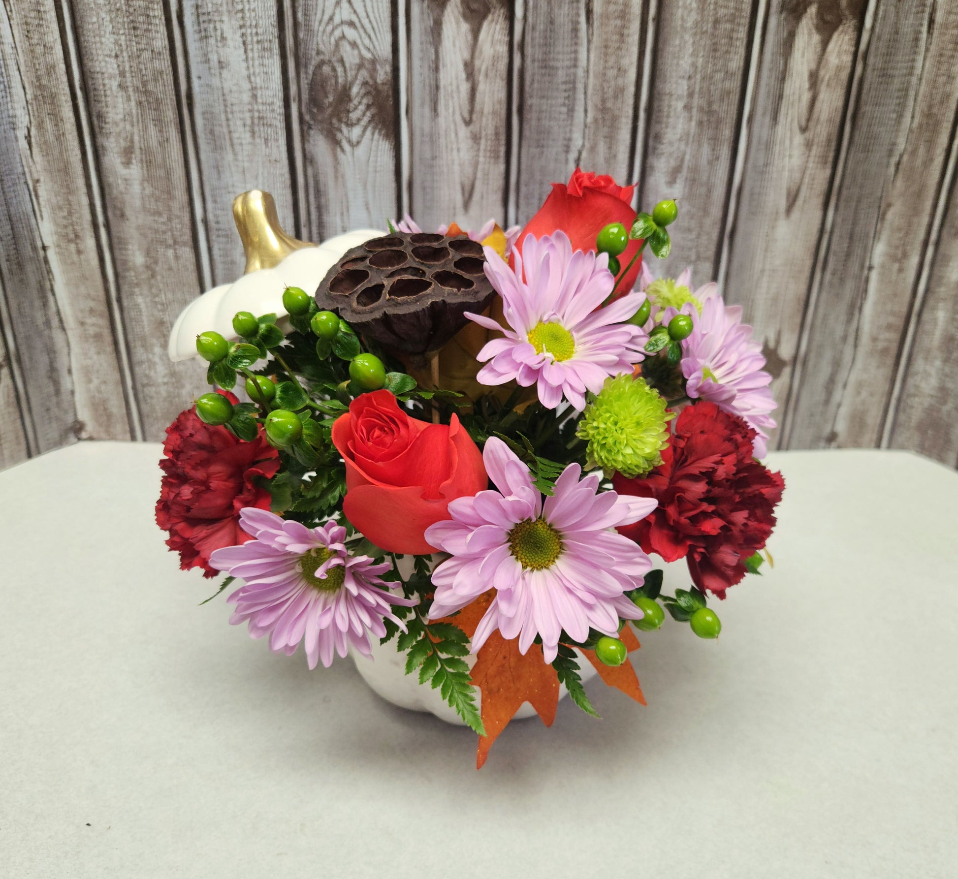 Harvest Light features a seasonal selection of fresh fall blooms arranged in a charming white pumpkin container with a gold stem for an added touch of elegance. This festive keepsake brings a soft, cozy glow to any space and can be reused year after year to celebrate the beauty of autumn.
